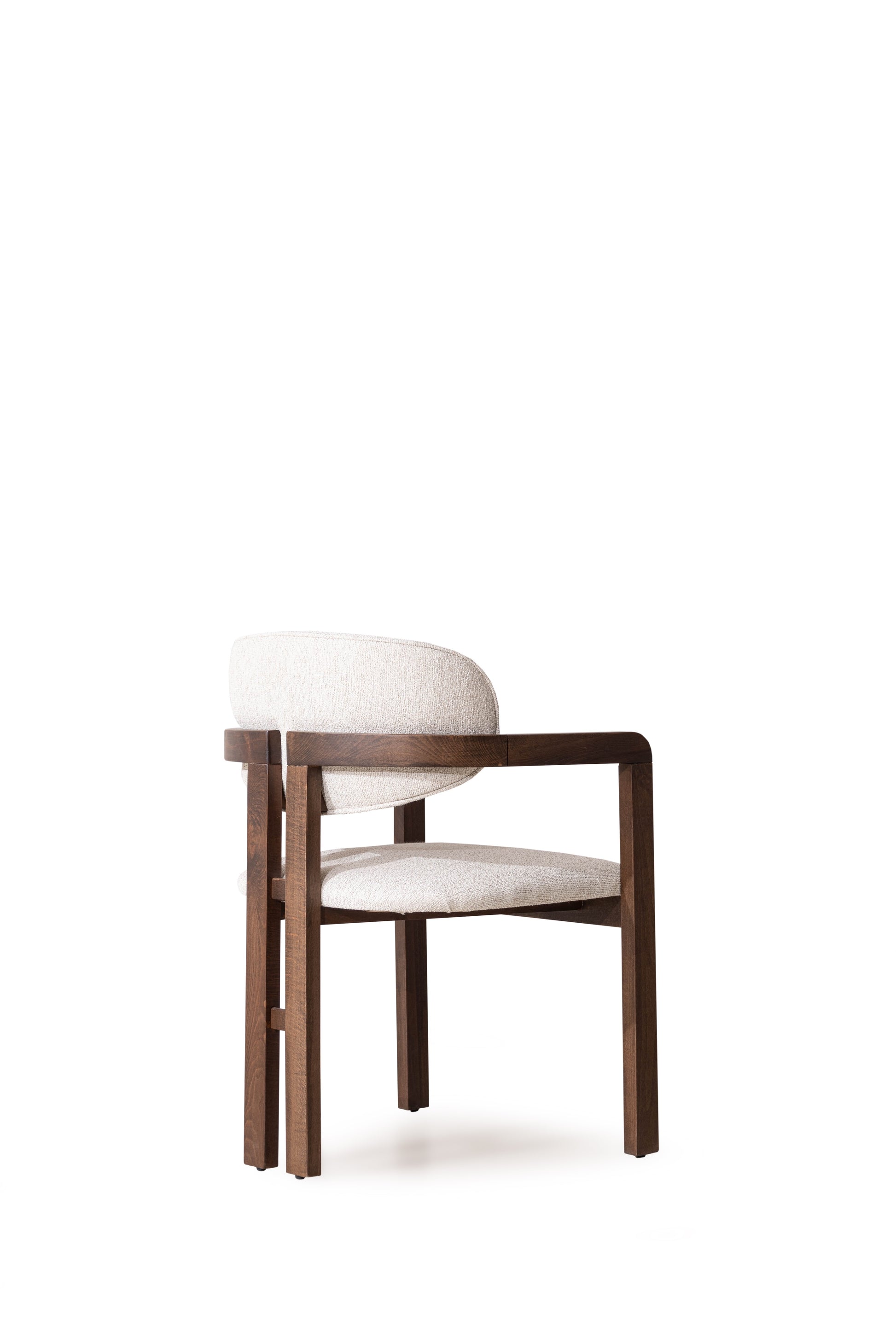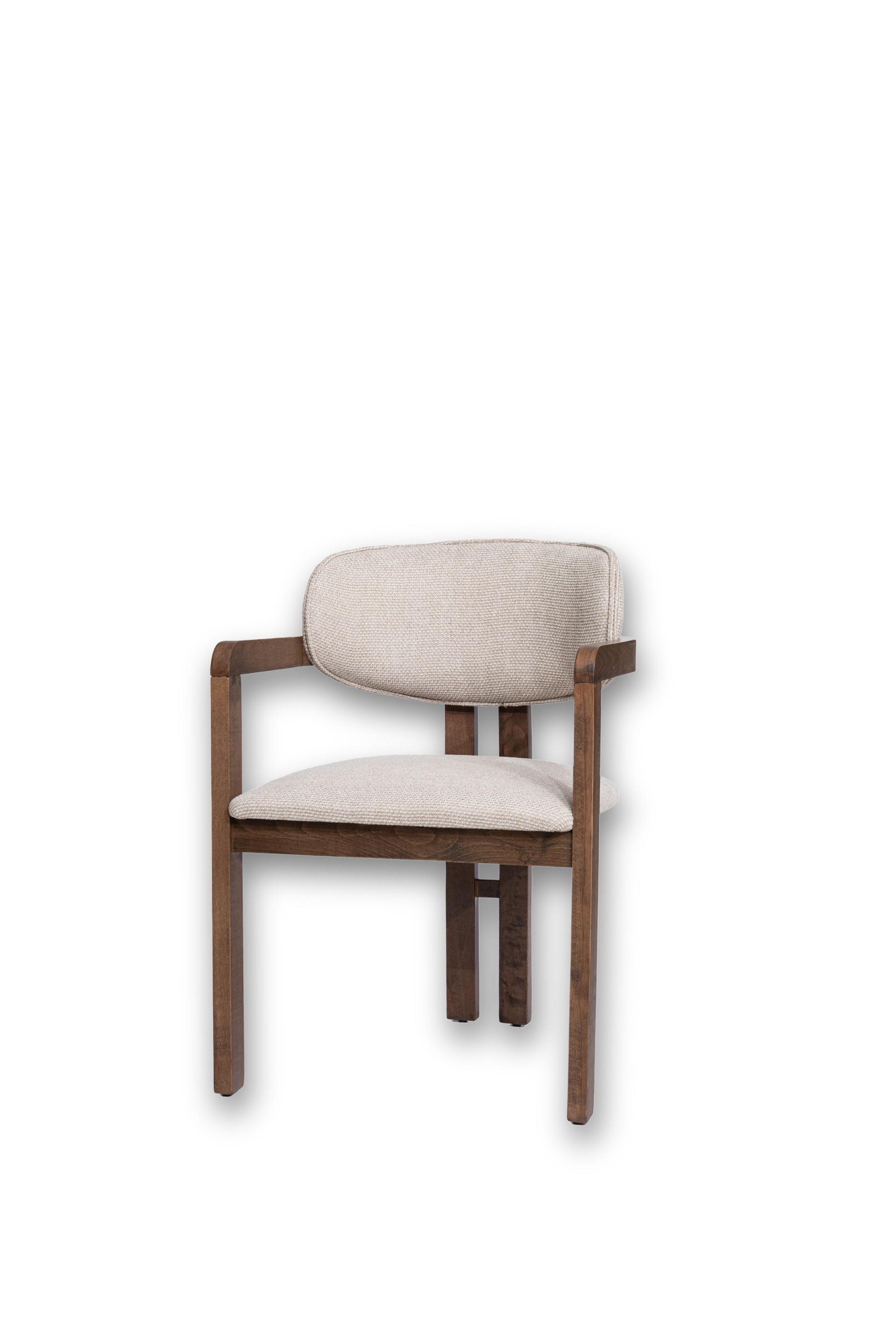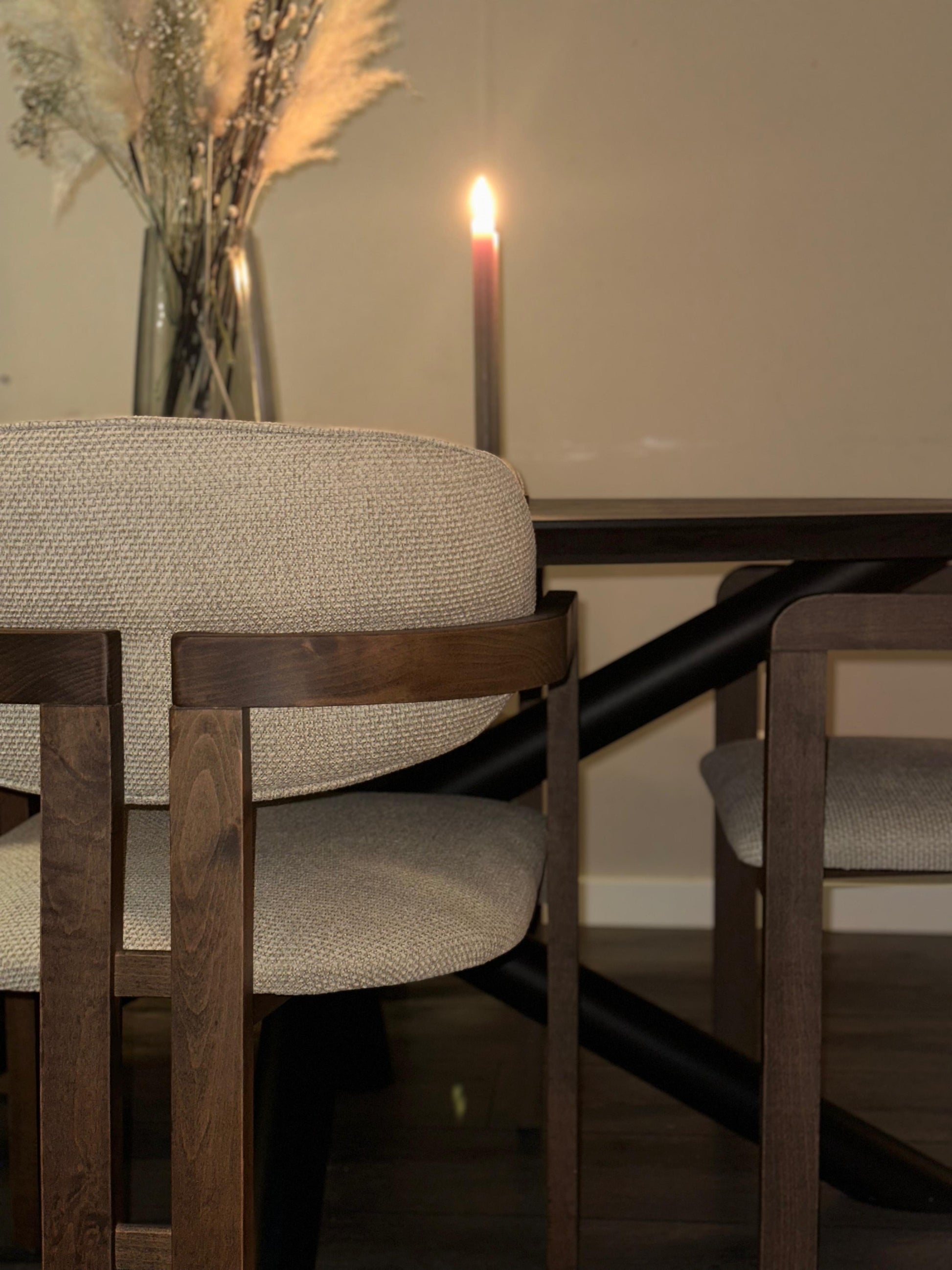 Stijlvolle en minimalistische beige Japandi eetkamerstoel, comfortabele stoffen bekleding, elegant walnoot houten poten, hoogwaardige afwerking.