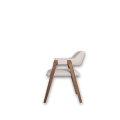 Stijlvolle en minimalistische beige Japandi eetkamerstoel, perfect voor moderne en serene interieurs. De stoel heeft een comfortabele, stoffen bekleding en is voorzien van elegant walnoot houten poten en een hoogwaardige afwerking. Een ideale keuze voor wie eenvoud en functionaliteit combineert met een warme uitstraling.